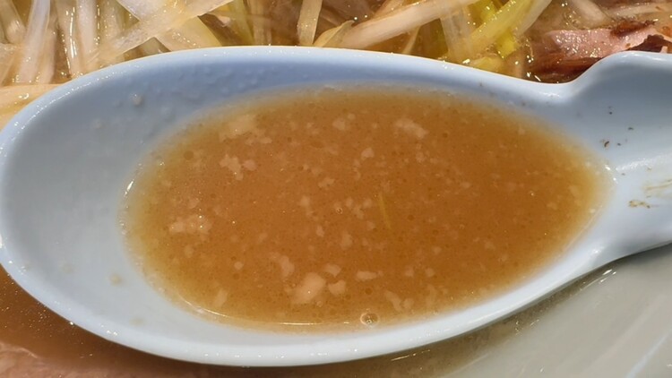 背脂の浮いたスープはしっかり乳化した感じでマイルドで美味い。ちなみに店名とは関係ないそうだが、化調も効いている。